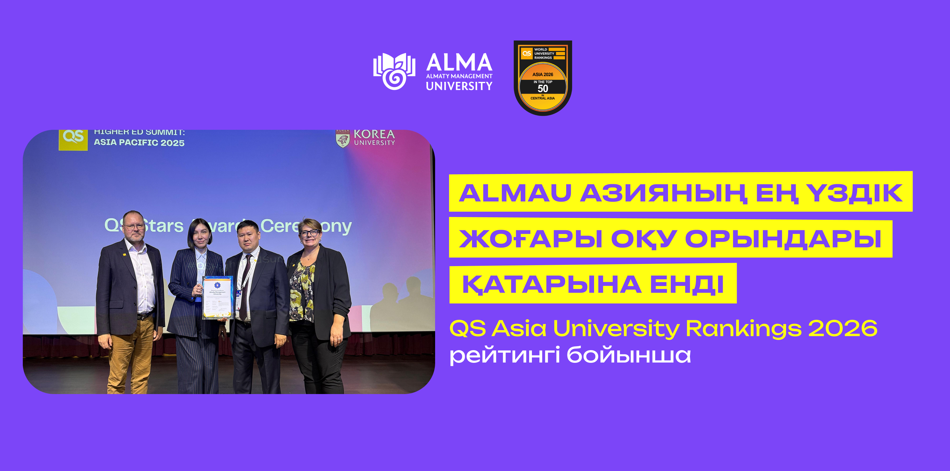 әлемдік деңгейдегі кәсіпкерлік, әлеуметтік жауапкершілігі бар университет. AlmaU студенттерге халықаралық деңгейде білім беру мақсатында Аризона штатының университетімен серіктестік орнатқан. 35 жылдан астам уақыт білім беру нарығында. Еліміздің ең алғашқы жеке жоғары оқу орны.  Қазақстандағы №1-ші бизнес мектеп. ТМД-дағы бизнес саласында білім берудің ізашары. Университет еліміздің алғашқы кәсіпкерлерін менеджментке үйреткен. Сондай-ақ, ҚР-дағы алғашқы МВА және DBA бағдарламалары ашылып, үздік оқытушылар мен сұранысқа ие түлектер AlmaU-дан шыққан.
