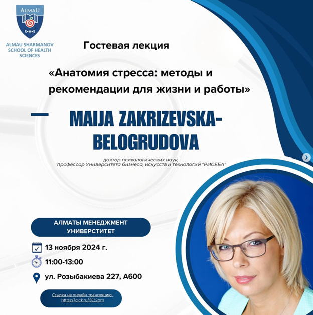 On November 13, 2024, Sharmanov School of Health Sciences hosted guest lectures by Maija Zakrizevska-Belogrudova, Doctor of Psychology and Professor at RISEBA University of Business, Arts and Technology, and Igor Kim, psychologist and author of the training program “Emotional Freedom.” The event took place in Auditorium A600 and included two sessions. The lecturers shared their expertise in psychology and emotional well-being, which sparked great interest among students and faculty members