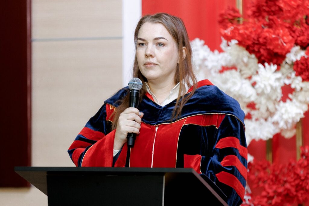 Продолжила приветственное слово Ксения Южанинова-Караденизли, декан GSB AlmaU. Она провела традиционную церемонию с кисточкой, символизирующую переход выпускников в сообщество профессионалов.